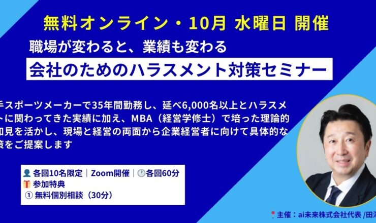 セミナー開催のご案内 企業経営者の皆さまを対象に、会社のハラスメント対策セミナーを無料オンラインで開催いたします。パワハラ・セ...