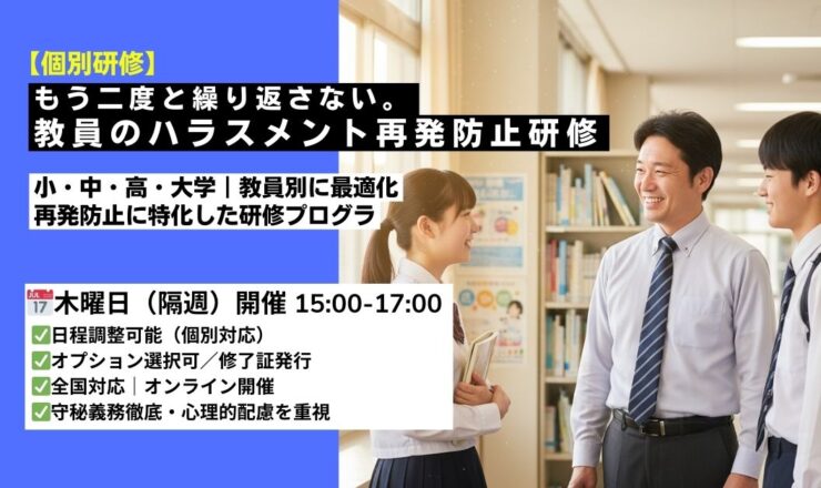 教員・管理職のハラスメント再発防止研修【個別対応・120分】 本研修は、処分や反省のためではなく、再発を防ぐために「行動をどう...