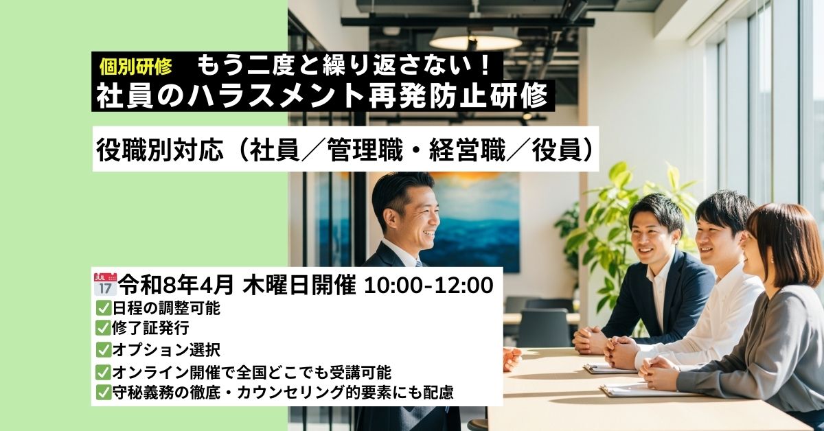 2026年4月開催|ハラスメント再発防止研修(オンライン1on1・120分)