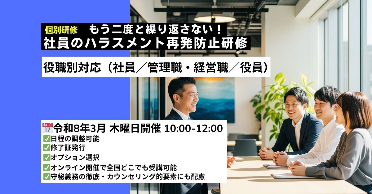 2026年3月開催|ハラスメント再発防止研修(オンライン1on1・120分)