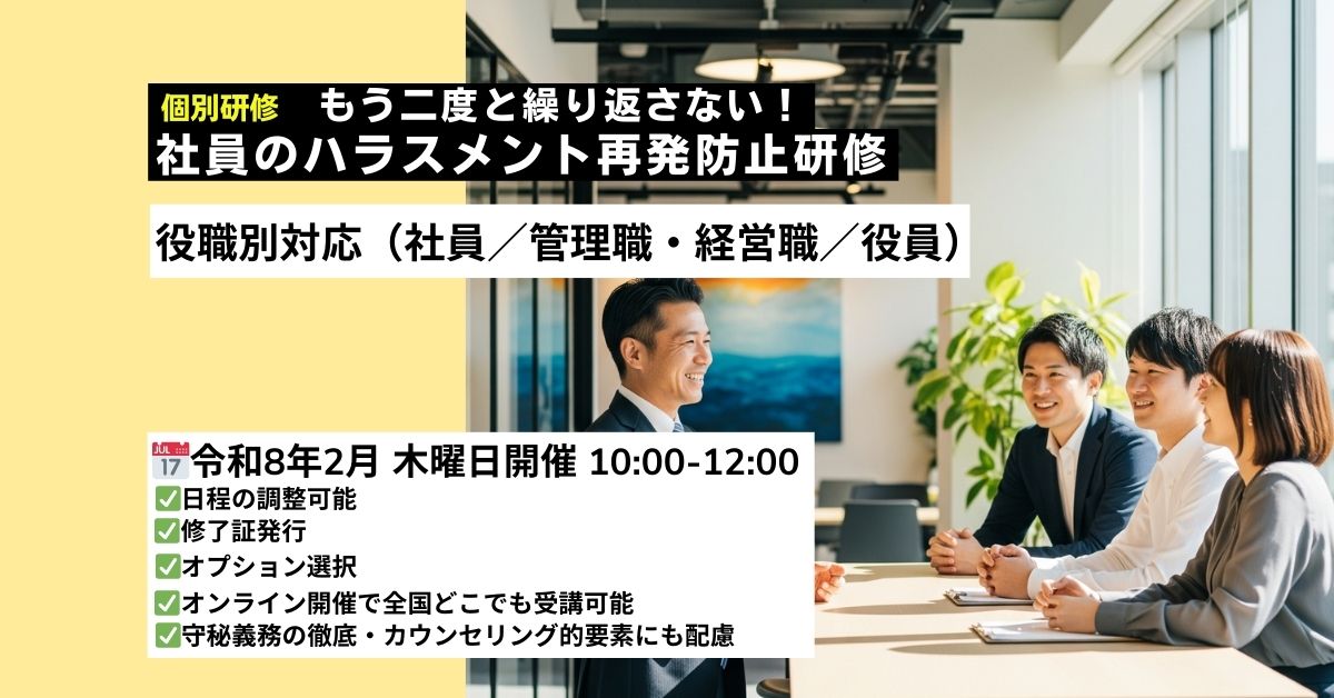 2026年2月開催|ハラスメント再発防止研修(オンライン1on1・120分)