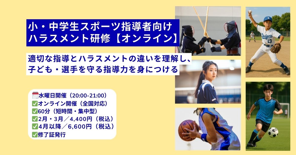 本研修では、小学・中学生を指導するスポーツ指導者を対象に、パワーハラスメント・セクシャルハラスメントの正しい理解と、現場で実践できる行動改善を、具体事例とともに学びます。