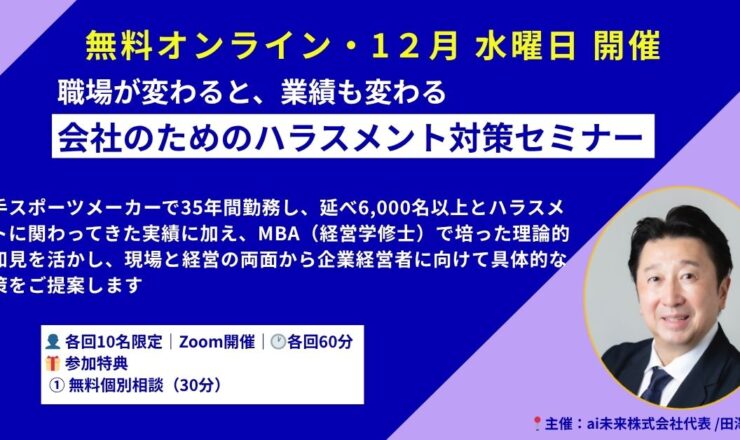 セミナー開催のご案内 企業経営者の皆さまを対象に、会社のハラスメント対策セミナーを無料オンラインで開催いたします。パワハラ・セ...